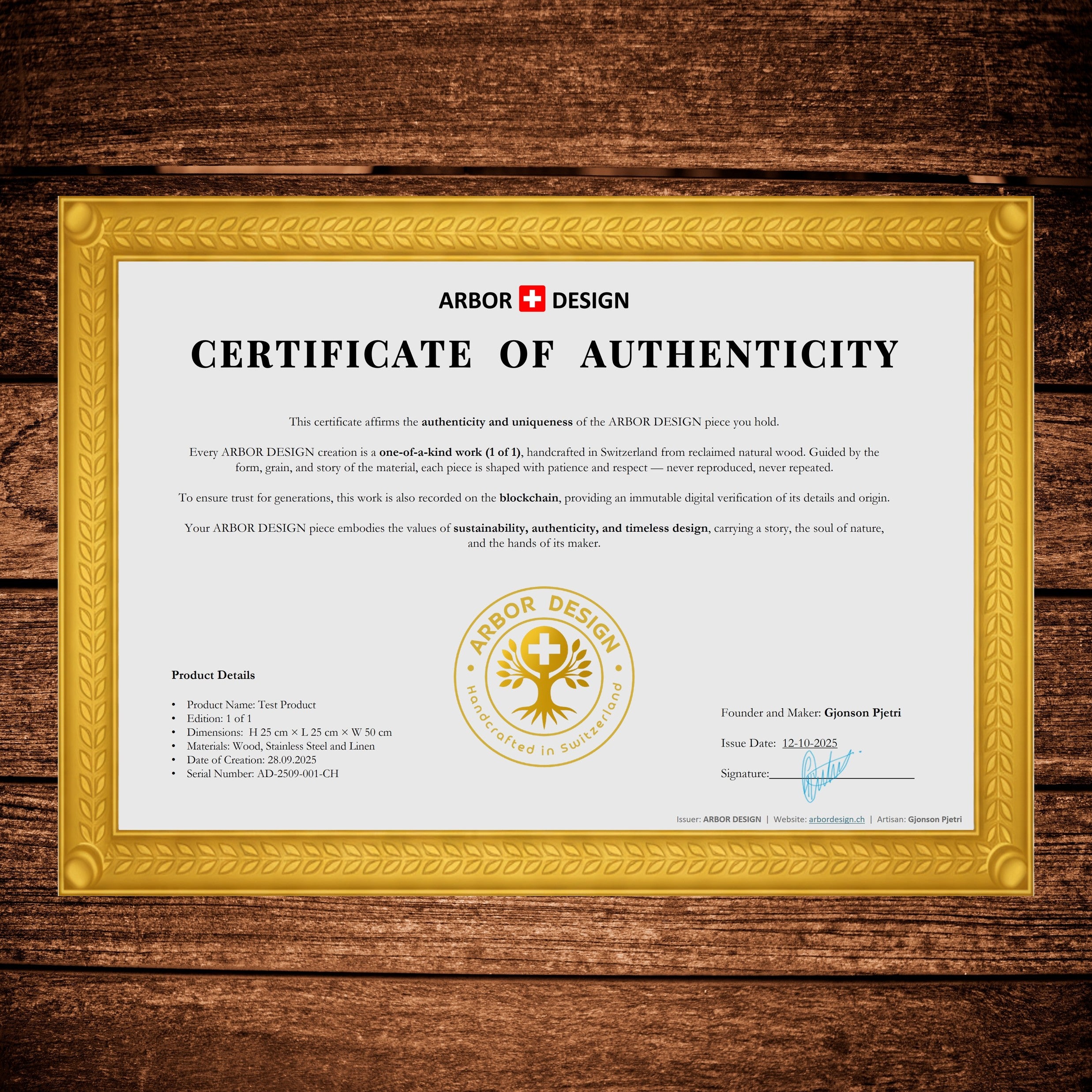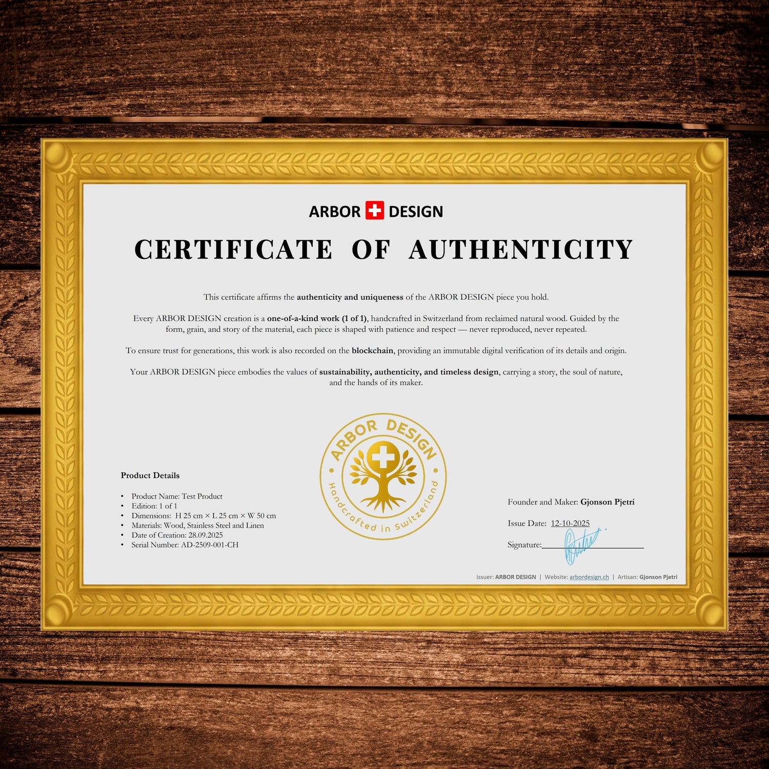 Every Arbor Design piece includes a dual Certificate of Authenticity: A hand-signed paper certificate and a digital SmartCertificate, secured on the blockchain